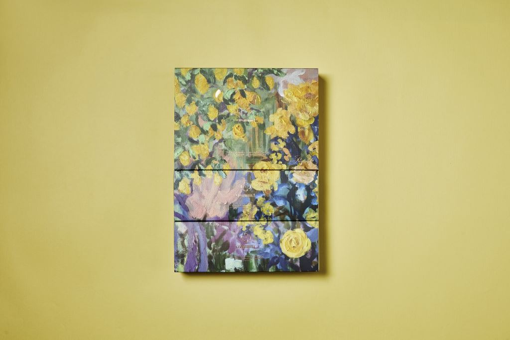 creammm.t x 英國藝術家 Shizico Yi 禮盒概念來⾃英國藝術家 Shizico Yi 的油畫作品, 盒⾯呈現細緻筆觸、層層堆疊的油彩質地, 畫⾯中盛開的檸檬樹,承載著⿈⾊與紫⾊, 分別象徵 creammm.t 與裸放茶旅, ⼀同在光影下呈現出如畫布般的⽴體感。 盒⾝燙⾦點綴,隨著開盒, 圖像緩緩拼合成⼀幅完整畫作 以花卉油畫的筆觸與⾊調,傳遞⼀種體驗、⼀種品味。 彷彿漫步於⼀座靜謐、夢幻的花園中。
